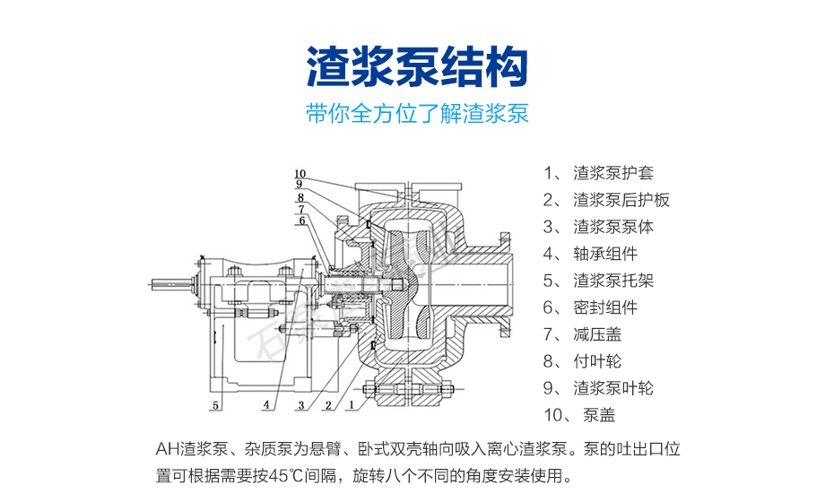 AH九游会·j9中国官方网站-首页结构:AH九游会·j9中国官方网站-首页、杂质泵为悬臂、卧式双壳轴向吸入离心九游会·j9中国官方网站-首页。泵的吐出口位置可根据需要按45℃间隔,旋转八个不同的角度安装使用。