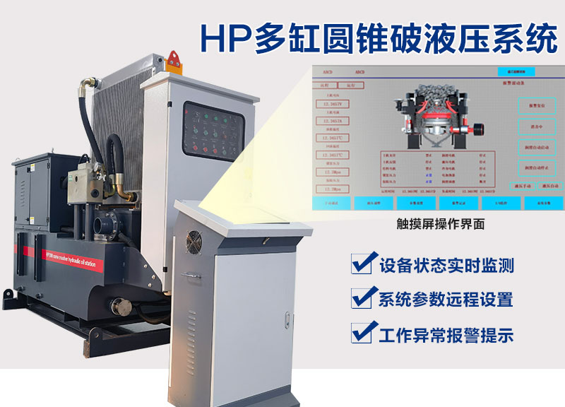 HP500型圆锥破碎机是一种应用非常广泛的破碎机械,其具有破碎效率高、高性能、给矿时电流波动小等优点。液压系统是圆锥破碎机的主要组成部分之一,它集成在润滑站上,主要包括液压站、锁紧缸、过铁释放缸、蓄能器和连接油管等。其主要具有以下几个功能:
